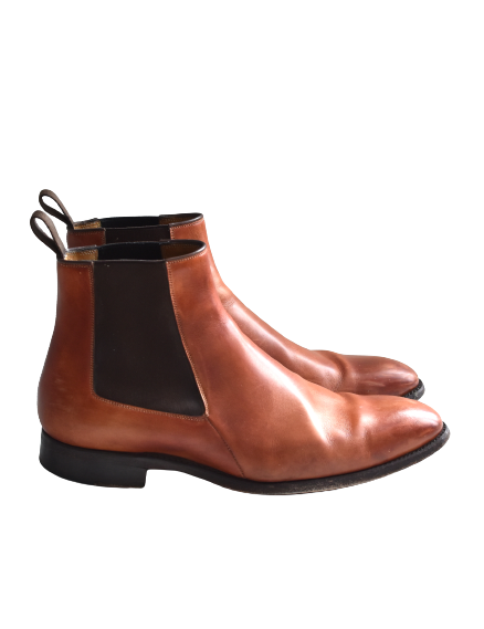 Carlos Santos Chelsea boot voor heren. De Chelsea boot heeft een tijdloos elegant design. De boot heeft een nauwsluitende slanke pasvorm, perfect voor elke gelegenheid of stijl. De laars heeft een leren zool met een Goodyear Welted constructie en is volledig met leer gevoerd. Door de klassieke elastische inzetstukken en lus is de enkellaars eenvoudig aan- en uit te trekken. Handgemaakt in Portugal. Deze chelsea boots zijn in zeer goede staat en zonder noemenswaardige beschadigingen en gebreken. Deze boots komen uit het hoogste fashion-segment.